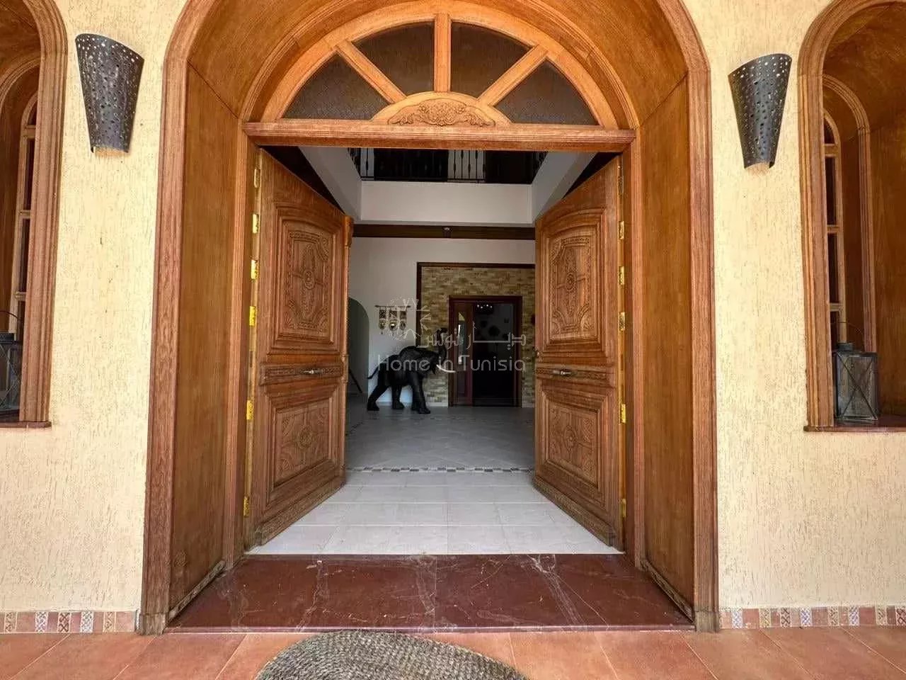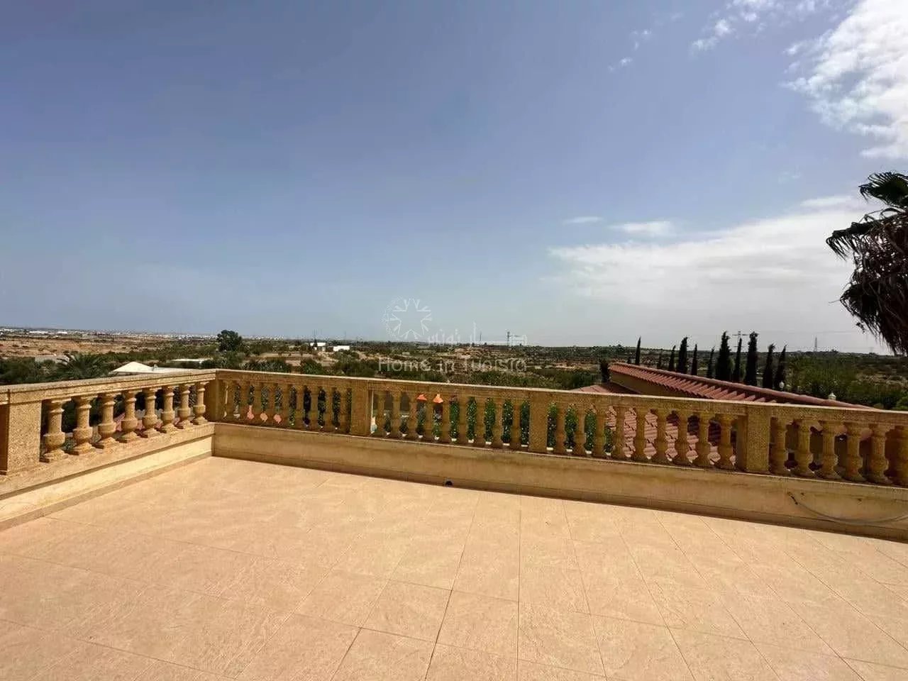 Au total la villa a 3 cuisines équipées : une au RDC (avec une pièce à côté comme cellier (bit mouna), une au Rez de jardin et une autre à l'extérieur (équipée de plancha industrielle)