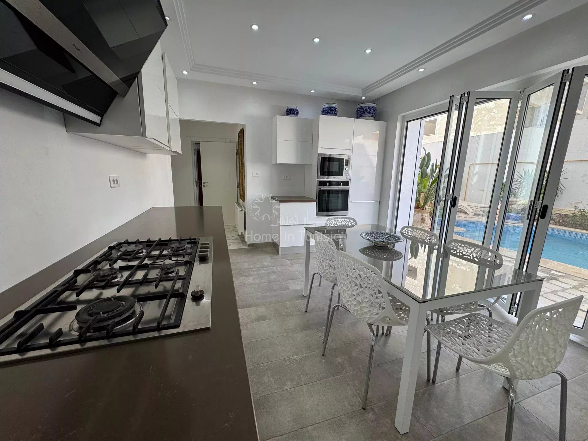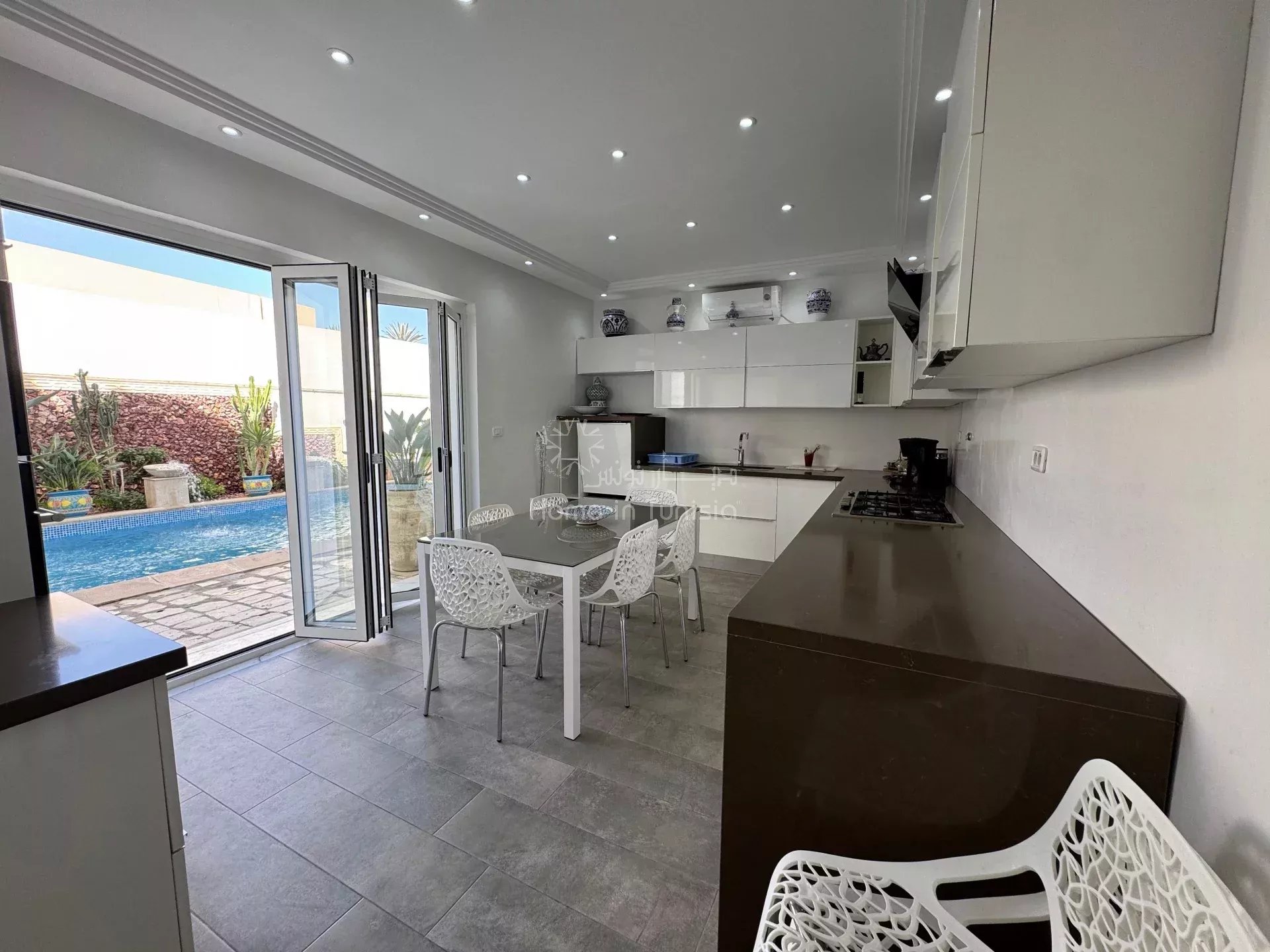 Un cuisine totalement équipée ouvrant sur la piscine d'une dimensions 804 / 4 mètres.